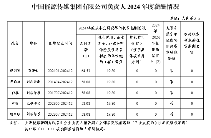 按照党中央、国务院《关于深化中央管理企业负责人薪酬制度改革的意见》规定,现将中国能源传媒集团有限公司负责人2024年度薪酬信息披露如下: